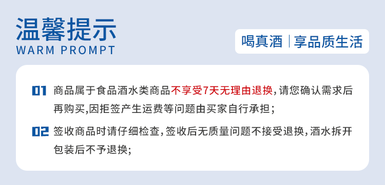 饮酒危害健康,合理饮酒,切勿过量;未成年人请勿购买酒类商品;孕妇、哺乳期妇女请勿饮酒;酒后请勿驾车。